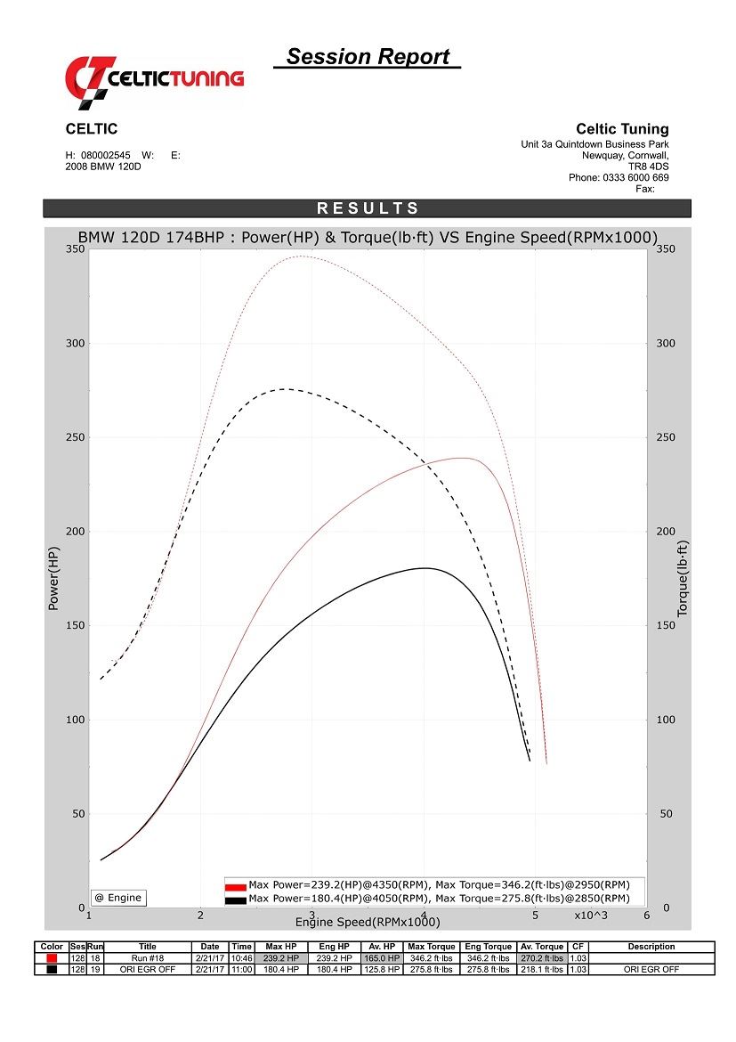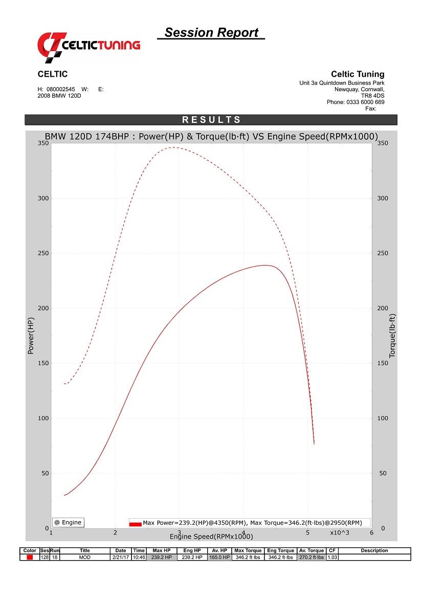 El gráfico 1 es un 120d de 174 CV con la ejecución anterior y la ejecución modificada en el mismo gráfico. En esto se pueden ver claramente las ganancias como un medio de comparación y las cifras tienen cierta relevancia en cuanto a lo que se está recibiendo de la afinación.