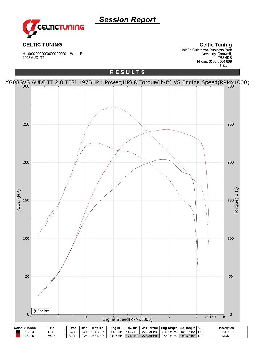 El gráfico 4 es de un Audi TT 2.0 TFSi de 197 CV con sistema de gestión Bosch MED9.1. Se puede ver que se fabrica en torno a las cifras de serie que producen 204 CV y un pico modificado de 243 CV.